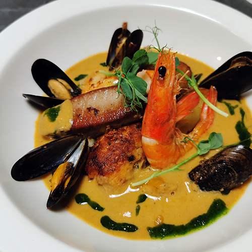 La marmite du pêcheur est généralement préparée avec une variété de fruits de mer, tels que des poissons blancs, des coquillages, des crustacés, des calamars et des crevettes, ainsi que des légumes tels que des oignons, de l'ail, des tomates et du persil. Le tout est cuit ensemble dans un bouillon de poisson parfumé avec des épices et des herbes, comme le safran, le thym et le laurier, pour donner une saveur riche et complexe.