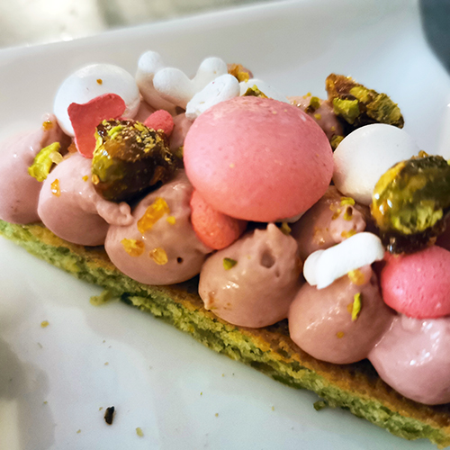 Pâtisserie française qui associe la saveur fruitée et acidulée de la framboise avec la saveur douce et légèrement noisettée de la pistache. Cette pâtisserie est souvent réalisée sous forme de tartelette individuelle.