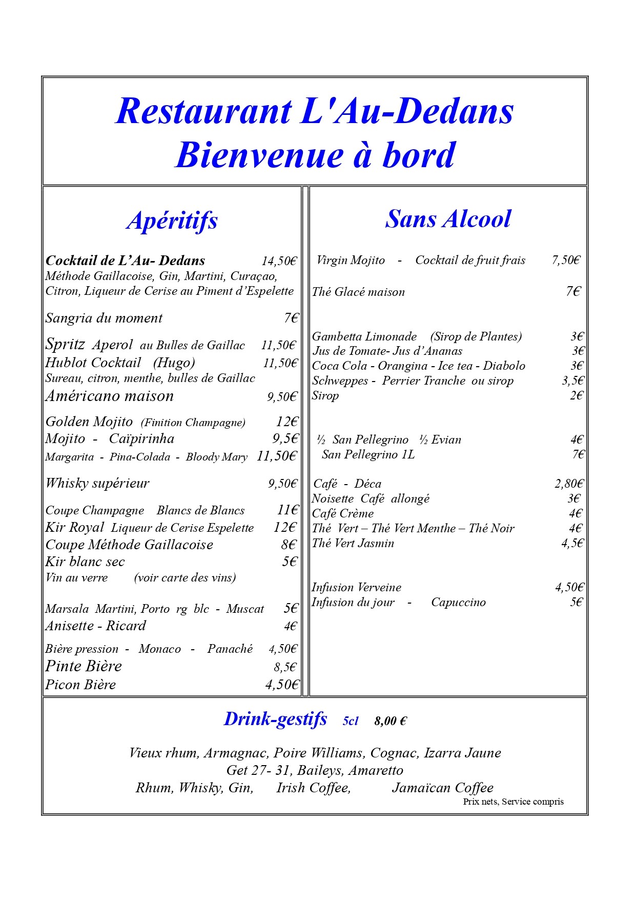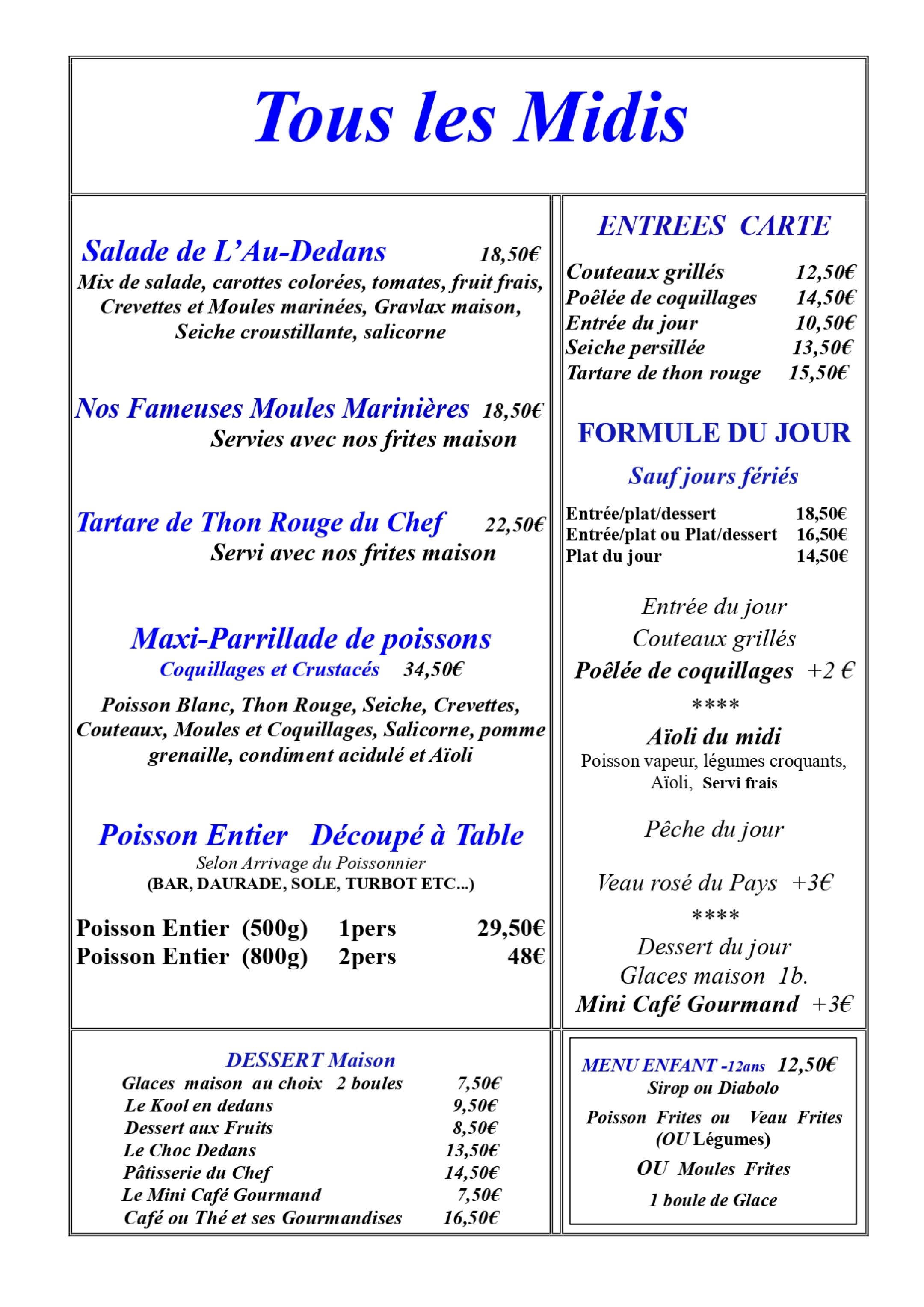 Encore un excellent moment passé au restaurant L’Au Dedans. Produits ultra frais, qualité des fruits de mer et bonne humeur au rendez vous comme toujours. On reviendra !