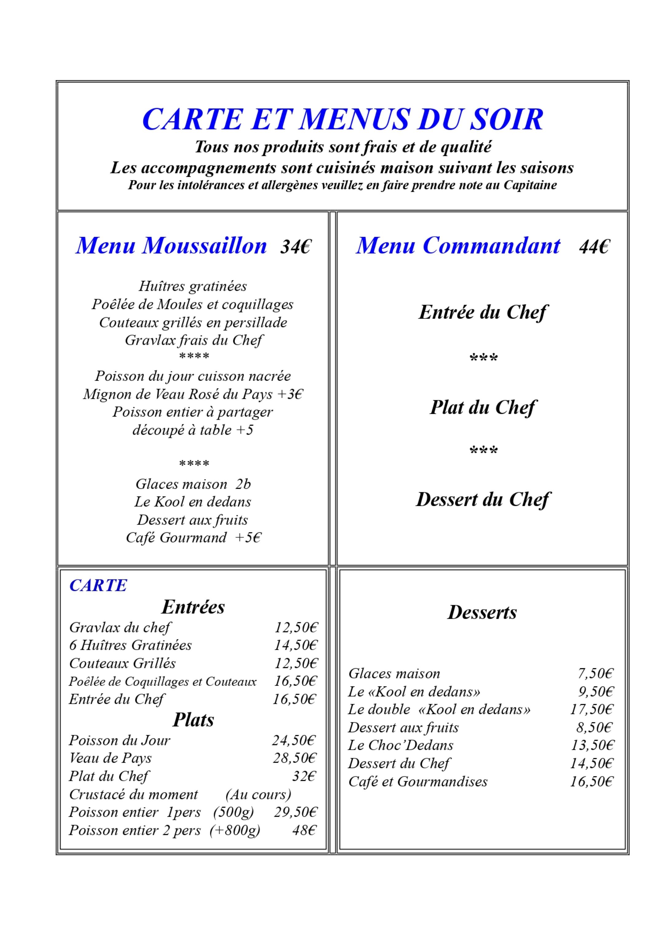 Super restaurant. On y a été mon compagnon et mes deux petits fils. L accueil excellent, la personne nous accompagne jusqu à notre table, la déco est sympa on se croirait dans un bateau. On se sent bien. Le menu est excellent, poisson très frais et très bon, et on a le droit de changer de dessert pour les petits avec un léger supplément. Le serveur vous recommande le vin qu il faut en fonction du repas ce qui est bien. N hésitez pas à réserver, vous ne regretterez pas. À bientôt.